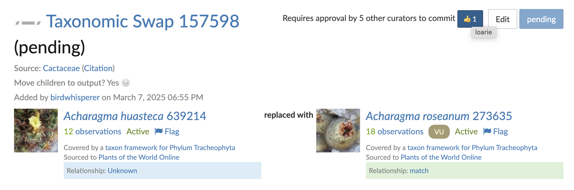 For non plants the Taxon Change will be immediately committed and cannot be reversed. For plants, the taxon change will enter a "Pending" state that requires approval votes from 5 curators other than the curator drafting the taxon change to enter the "Approved" state. Once in the "Approved" state, the taxon change can be committed.