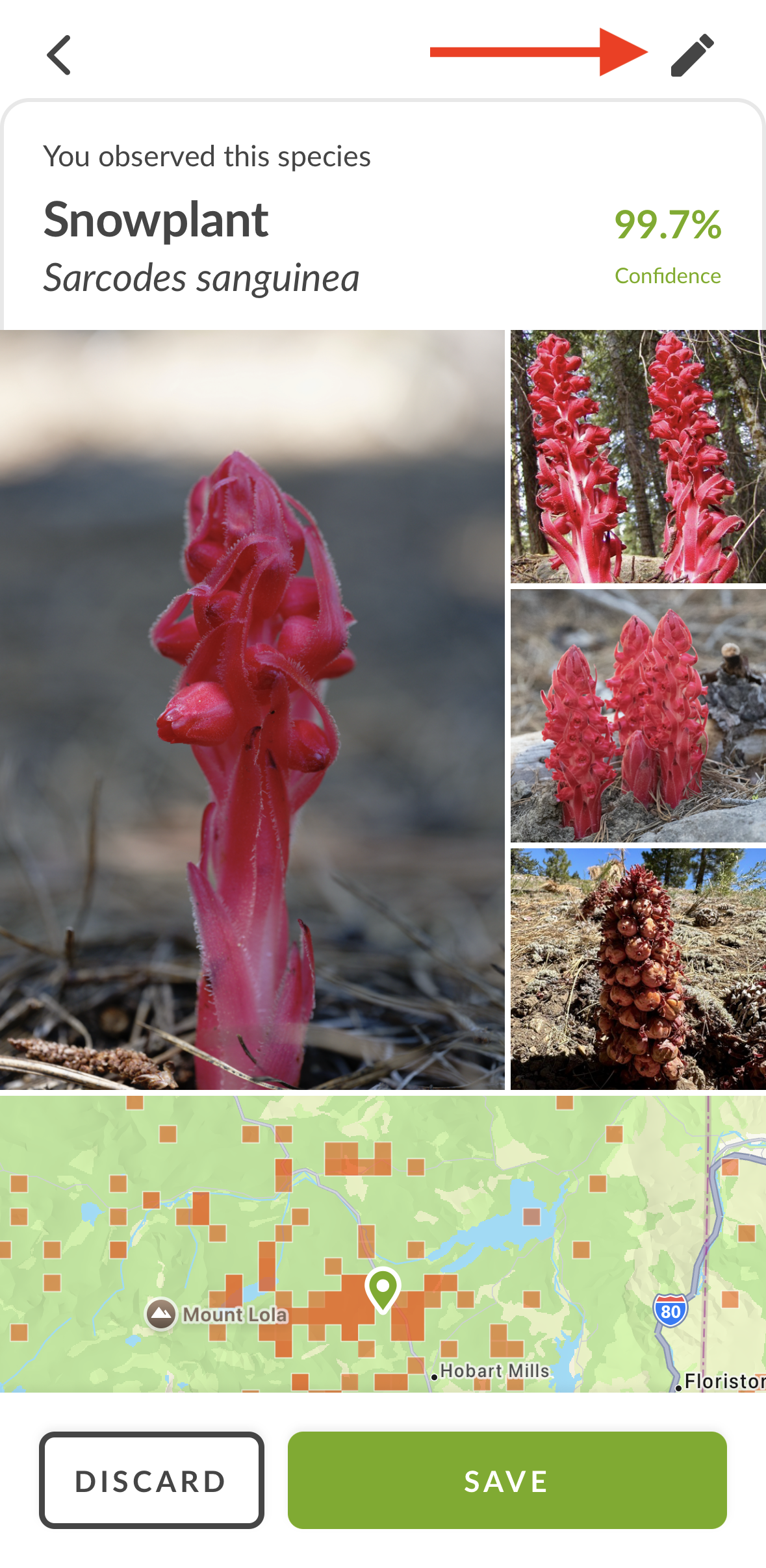 When making a new photo observation you will be taken to the Match Screen, which shows your photo alongside photos of iNaturalist's top species suggestion, a map of that species near the observation's location, and other identification suggestions for your photo. Tap the pencil icon (red arrow, below) to access the edit page for the observation, where you have more ID options, can mark the organism as captive/cultivated if need be, and edit its geoprivacy.